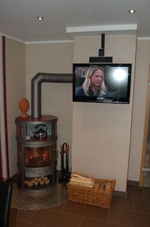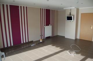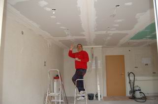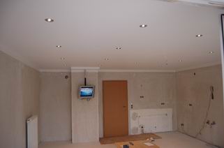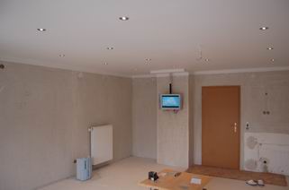 Endlich konnten wir die Decke streichen (3x) und die Lampen einbauen, schaut einfach klasse aus, wir sind froh die alte Holzdecke entfernt zu haben. Die Löcher im Estrich sind auch ausgebessert. Wandhalterung und Kabel für TV funktioniert auch alles, ab jetzt habe ich Fernsehen auf der Baustelle. ;o)