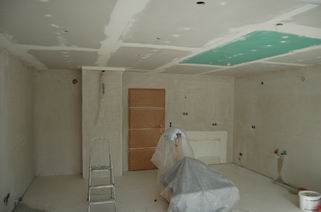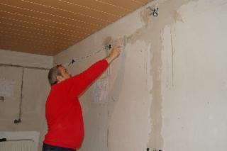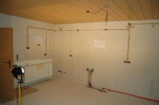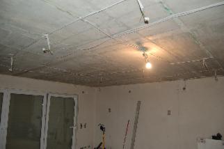 Rigipsdecke eingezogen und Lampen vorbereitet. Heizkörper versetzt. Elektrokabel unter der Holzdecke im Keller verlegt.