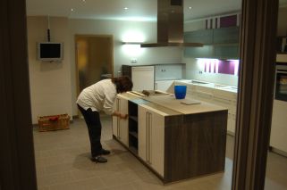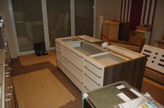 Am 16.11. wird auch zunächst die Zeile und Insel aufgebaut und dann erst die Arbeitsplatte für den Granit vermessen.Dieser wird dann 14 Tage später geliefert. Gabi misst jetzt zeitliche Abschnitte nur noch in Küchentermine..... Grins.